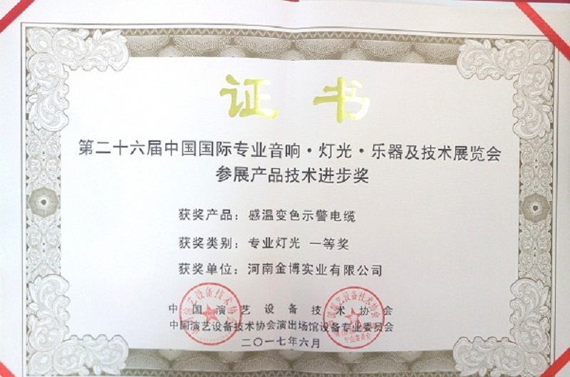 2017 PALM展共有50多家家企業(yè)100多項(xiàng)產(chǎn)品積極申報(bào)了了產(chǎn)品技術(shù)進(jìn)步獎(jiǎng)的各類獎(jiǎng)項(xiàng)。經(jīng)展會主辦方-中國演藝設(shè)備技術(shù)協(xié)會技術(shù)部門的初審,以及協(xié)會專家團(tuán)隊(duì)在展會上的現(xiàn)場評審,河南金博實(shí)業(yè)有限公司的“感溫變色示警電纜”產(chǎn)品 榮獲***燈光 一等獎(jiǎng)。